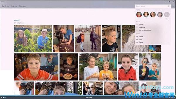 照片UWP和現款有了很大區別,新版縮略圖有了三種尺寸(大、小、全屏),這對于很多分辨率并不高的Win10設備來說是一個很人性化的變化。搜索框是老版中沒有的功能,你可以在這里輸入Tag或者關鍵字來搜索圖片。而且Win10的智能化體現在,它的Tag全部是由系統自動生成,換句話說你可以在這里直接輸入“汽車”、“風景”來搜索自己感興趣的照片,而不用去管它的真實文件名是啥。此外截圖中還能隱約看到面部識別功能,這樣當你的相冊中包含多個好友時,搜索照片再也不會是一件難事了。