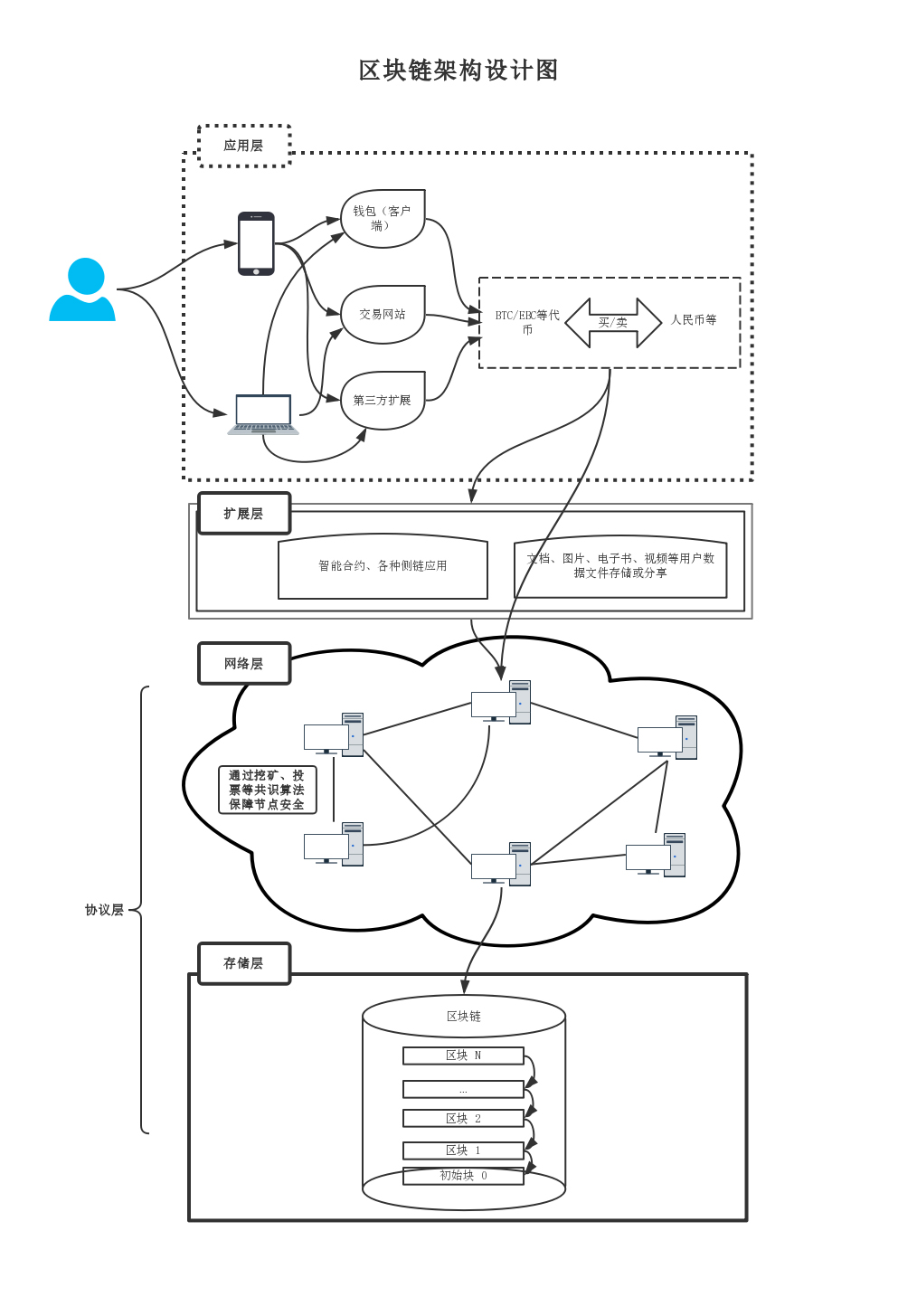 區塊鏈的技術架構分為應用層,拓展層和協議層;層與層之間是相互獨立但又緊密聯系的;
