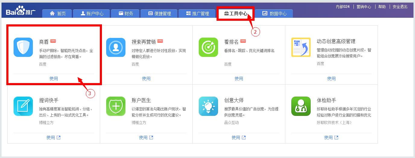 登錄推廣平臺->點擊搜索推廣->點擊工具中心->打開商盾
