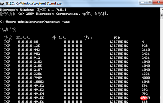 1.開始-》cmd-》輸入命令netstat -ano出現(xiàn)下圖所示(注意下邊顯示有些錯位,最后一列是PID):
