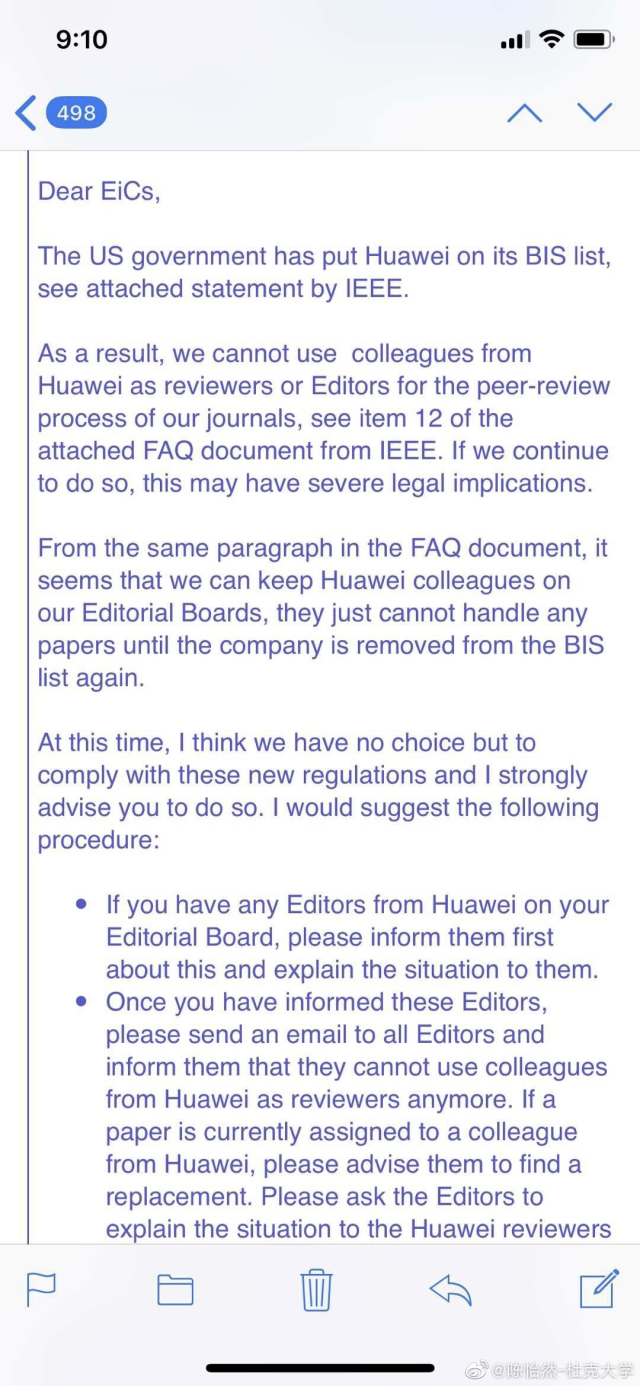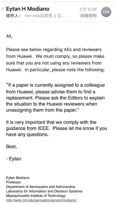 我們別無選擇,只能遵守這些新規定,強烈建議您執行以下程序:如果您的編輯委員會中有華為的編輯,請首先通知他們,并向他們解釋情況。一旦您通知了這些編輯,請向所有編輯發送電子郵件,并告知他們不能再使用華為員工作為審稿人。如果目前有論文被分配給華為員工,請建議他們尋找替代者。請編輯向華為審核人員解釋情況。”