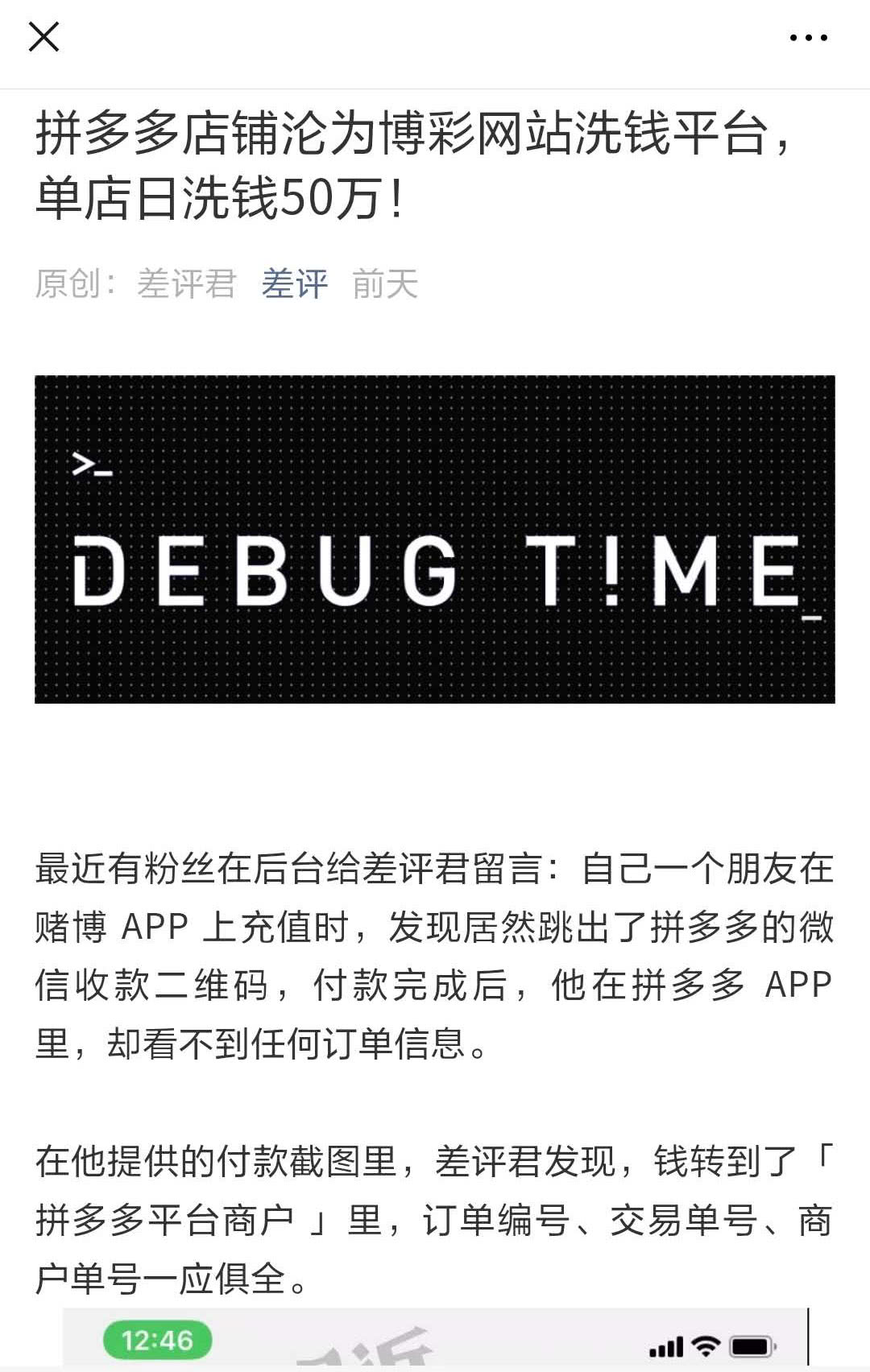 風控負責人表示:差評這位寫手將拼多多作為了“線上洗錢”的主流渠道和博彩網站收款的“支付通道”,既犯了常識性錯誤(拼多多不涉及任何支付通道行為)又對平臺進行了“觀點先行”之后的精心惡意中傷。