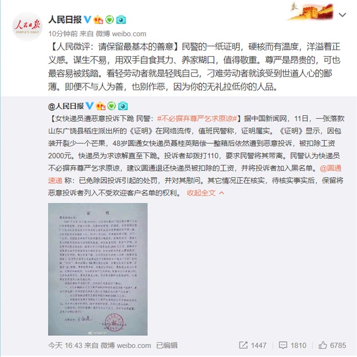 《證明》顯示,因包裝開裂少一個芒果,48歲圓通女快遞員聶桂英賠償一整箱后依然遭到惡意投訴,被扣除工資2000元。快遞員遭投訴下跪也得不到原諒。投訴者卻撥打110,要求民警將其帶離。民警認為快遞員不必摒棄尊嚴乞求原諒,建議圓通退還快遞員被扣除的工資,并將投訴者加入黑名單。事發后,圓通官方發表聲明稱業務員所在網點已免除因投訴引起的處罰,并對其進行慰問。