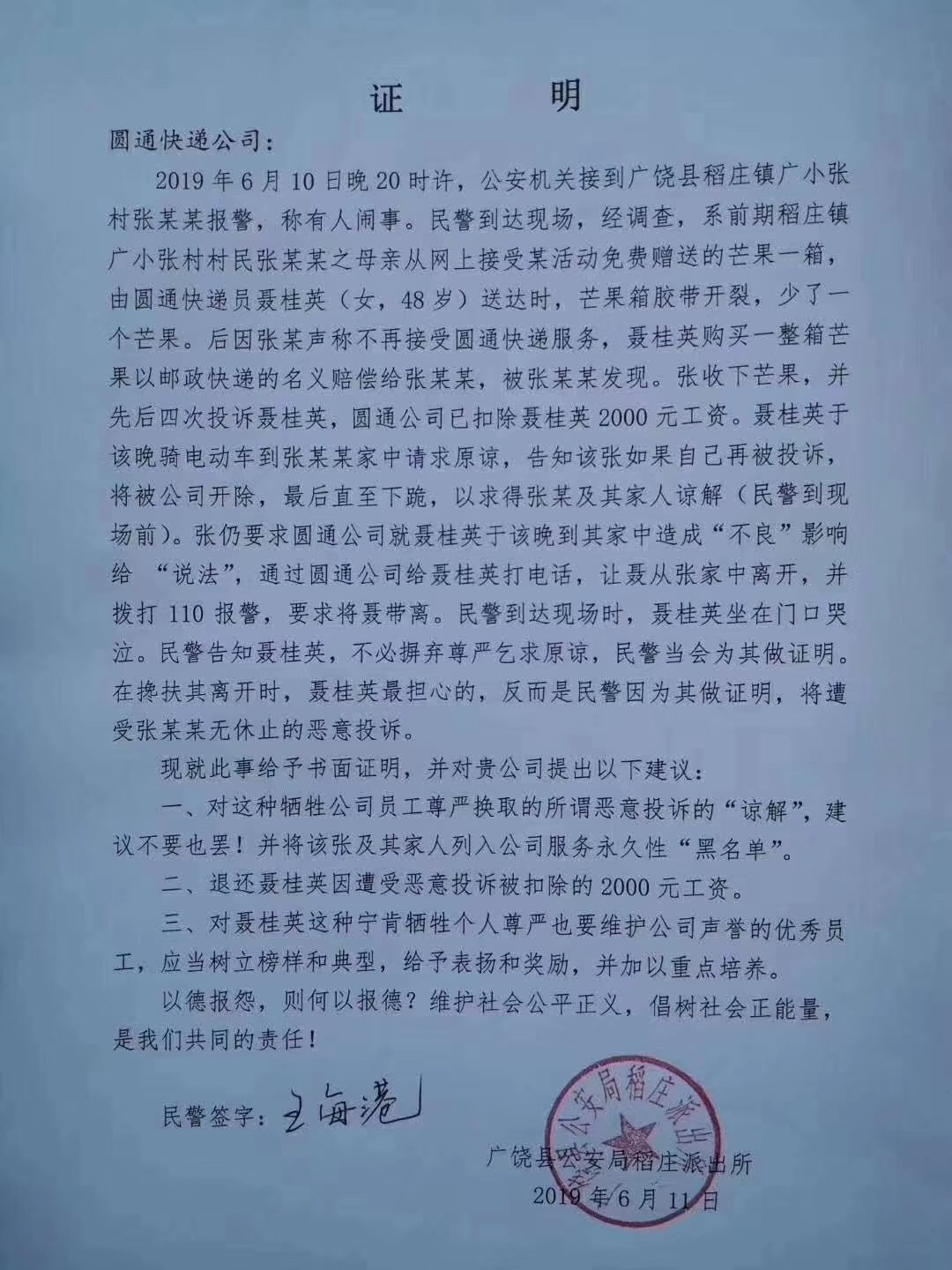 6月11日消息 今日,山東省廣饒縣公安局稻莊派出所出具的一份證明顯示,圓通一位女快遞員因遭用戶惡意投訴被扣除工資2000元,