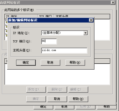 第三步,進入“高級網站標識”屬性面板后,保持“ip地址”、“TCP端口”、“主機頭值”下原有的默認值不變,點擊選擇“添加”按鈕,出現“添加\編輯網站標識”的對話框,保持“IP地址”默認值不變,將“TCP端口”設置成“80”,“主機頭值”是你要綁定的域名,可輸入你要綁定的網址,設置完成后點擊“確定”按鈕保存即可,如下圖:
