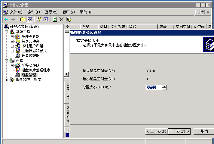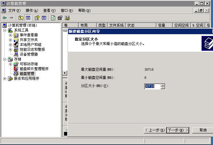 2.選擇磁盤管理,出現(xiàn)下圖,點(diǎn)下一步