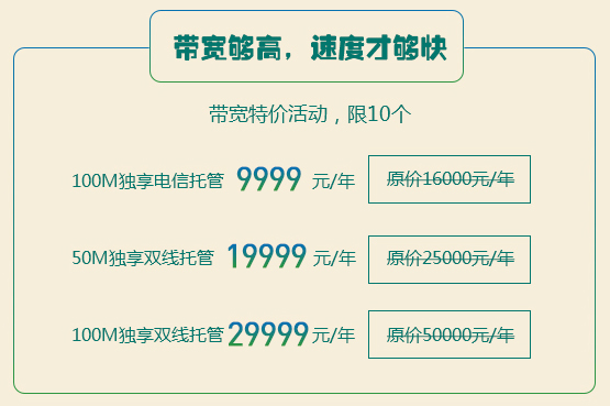 為了回饋新老客戶,億恩科技特別推出了服務器托管特價活動,100M獨享僅需9999元/年,原價16000元/年,活動力度是非常大的,名額有限,售完為止。