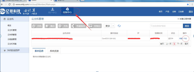 2、在云主機管理頁面,找到控制中心選項并點擊升級。